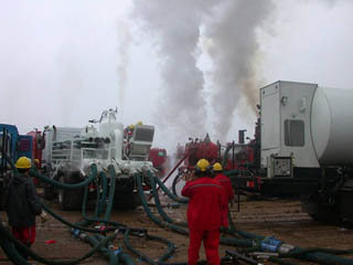 | 我公司紧跟国际新技术发展形势,为满足水力压裂工艺技术对压裂液的新要求,根据新的分子理论和多相流流变学理论,研制了新型的、可与CO2配伍的、清洁的压裂液。该压裂液无残渣、摩阻低、性能稳定,形成的泡沫稳定性好,是一种优良的CO2泡沫压裂液。 | |